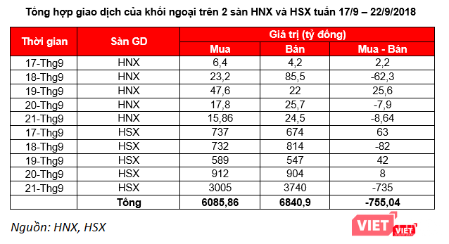 Tuần qua, nhà đầu tư nước ngoài có tuần bán ròng trên cả hai sàn với tổng giá trị là 755,04 tỷ đồng, tập trung phần lớn vào phiên giao dịch cuối tuần ngày 21/9/2018.