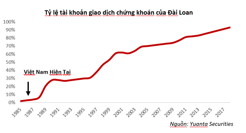 Vị chuyên gia của VinaCapital trích dẫn số liệu cho thấy, số lượng người có tài khoản giao dịch chứng khoán cá nhân ở Việt Nam chỉ chiếm khoảng 3% dân số cả nước. Song, con số này tương đương với tỷ lệ người dân Đài Loan có tài khoản giao dịch chứng khoán cá nhân vào năm 1986.