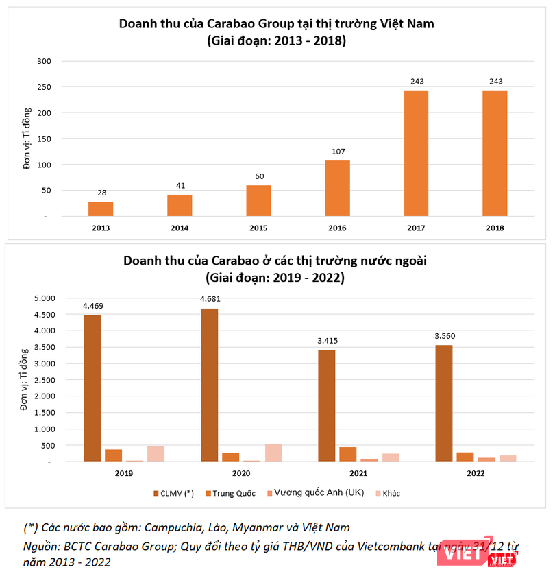 Dữ liệu của VietTimes cho thấy, Carabao Group đã bắt đầu ghi nhận doanh thu tại thị trường Việt Nam từ năm 2013, ở mức 44 triệu baht (khoảng 28 tỉ đồng), và ghi nhận mức tăng trưởng bình quân 58% trong 3 năm kế tiếp.