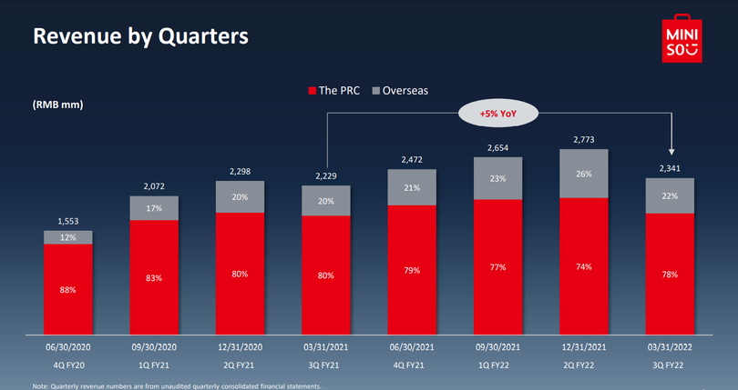 Lũy kế 9 tháng năm tài chính 2021 – 2022, Miniso ghi nhận doanh thu đạt 7,76 tỉ CNY (tương đương 1,22 tỉ USD), tăng 17,7% so với cùng kỳ năm ngoái. Lợi nhuận ròng là 431,2 triệu CNY (tương đương 68 triệu USD), trong khi cùng kỳ năm trước báo lỗ 1,54 tỉ CNY.