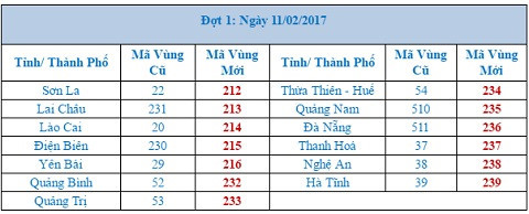 Trong giai đoạn 1 chuyển đổi mã vùng cố định sẽ diễn ra đêm nay, 13 tỉnh thành chuyển mã vùng cố định mới gồm: Đà Nẵng, Sơn La, Điện Biên, Lai Châu, Lào Cai, Yên Bái, Thanh Hoá, Nghệ An, Hà Tĩnh, Quảng Bình, Quảng Trị, Thừa Thiên- Huế, Quảng Nam.