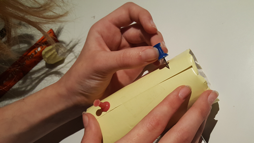 Bước cuối cùng, dùng ghim để cố định lõi giấy để sản phẩm có thể đứng vững khi đặt smartphone vào.