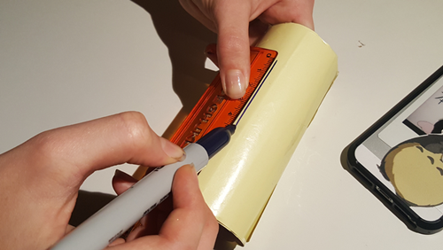 Bước 2: Dùng thước kẻ hoặc những công cụ có chức năng tương tự đo độ dài và bề dày của điện thoại, sau đó ướm và vẽ một hình chữ nhật tương ứng với kết quả vừa đo trên lõi giấy vệ sinh.