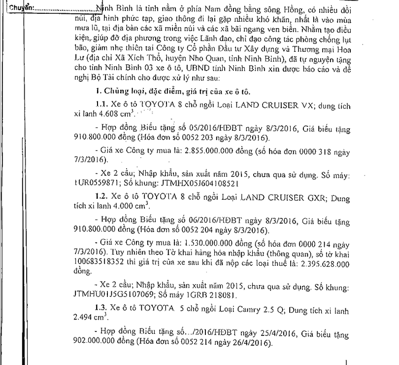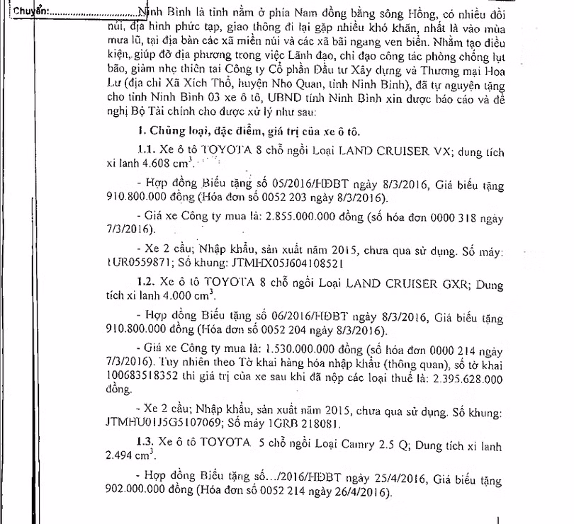 “Nhằm tạo điều kiện, giúp đỡ địa phương trong việc Lãnh đạo, chỉ đạo công tác phòng chống lụt bão, giảm nhẹ thiên tai, Công ty Cổ phần Đầu tư Xây dựng và Thương mại Hoa Lư (địa chỉ Xã Xích Thổ, huyện Nho Quan, tỉnh Ninh Bình), đã tự nguyện tặng cho tỉnh Ninh bình 03 xe ô tô”, văn bản của Ninh Bình nói rõ, rằng bên tặng “đã tự nguyện tặng”, rồi sau đó mới thông tin về các quà tặng.