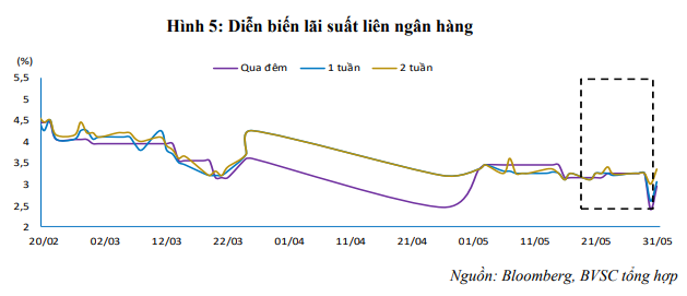Lãi suất liên ngân hàng tuần từ 27/5 - 31/5 cũng có xu hướng giảm ở đa số các kỳ hạn. Cụ thể, với kỳ hạn qua đêm và 1 tuần, lãi suất giảm lần lượt 0,3%/năm và 0,15%/năm, từ mức 3,25%/năm và 3,2%/năm xuống mức 2,95%/năm và 3,05%/năm. Đối với kỳ hạn 2 tuần, lãi suất lại tăng từ 3,23%/năm lên 3,35%/năm.