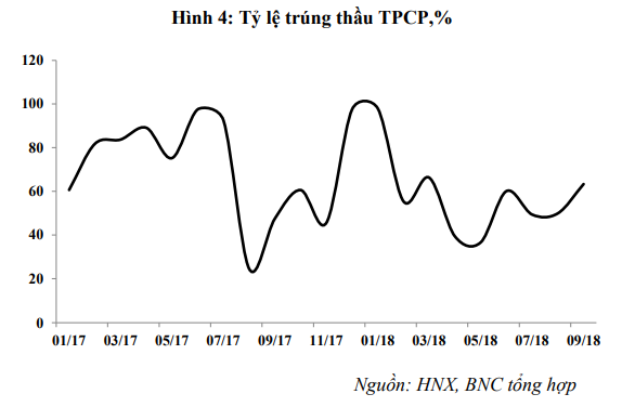 | Phát hành Trái phiếu Chính phủ chậm so với kế hoạch Theo Ủy ban Giám sát Tài chính Quốc gia (NFSC), lũy kế đến 30/9/2018, huy động Trái phiếu Chính phủ (TPCP) đạt gần 122 nghìn tỷ đồng, hoàn thành 61% kế hoạch năm (thấp hơn nhiều so với mức 90,45% của cùng kỳ 2017). Tỷ lệ trúng thầu tuy có tăng trong tháng 9/2018 (đạt 63,3% là mức cao nhất trong 6 tháng gần đây) nhưng chủ yếu do mức gọi thầu điều chỉnh giảm (tháng 9/2018 ở mức 24,8 nghìn tỷ đồng là mức thấp nhất trong vòng 5 tháng gần đây). Kho bạc Nhà nước đã chủ động giãn tiến độ phát hành TPCP để phù hợp với tiến độ giải ngân chậm từ vốn huy động TPCP.