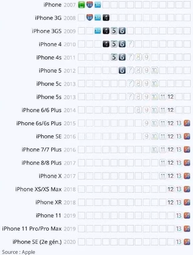 Như bảng trên có thể thấy, tuổi thọ chính thức của bất kỳ thế hệ iPhone nào là ít nhất ba năm. Nếu bạn bắt đầu với iPhone 4, con số này là bốn năm. Trong tất cả các danh sách, tuổi thọ dài nhất hiện tại là 6 năm, đó là iOS 7-12 cho iPhone 5s và iOS 9-14 cho iPhone 6s/ 6s Plus/ SE.
