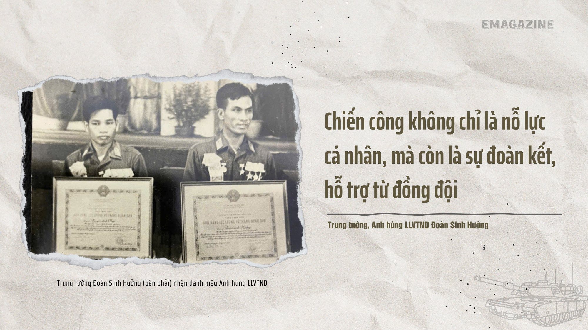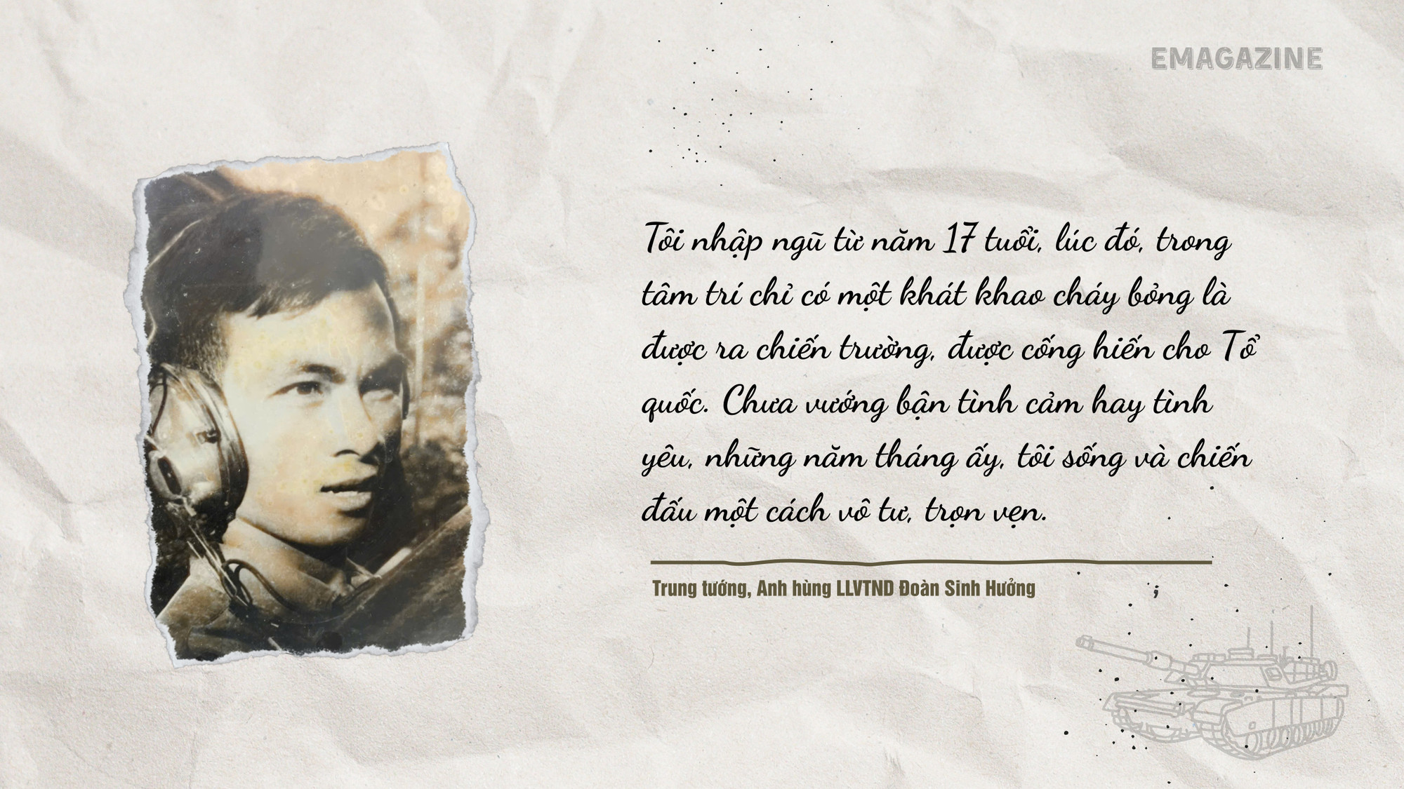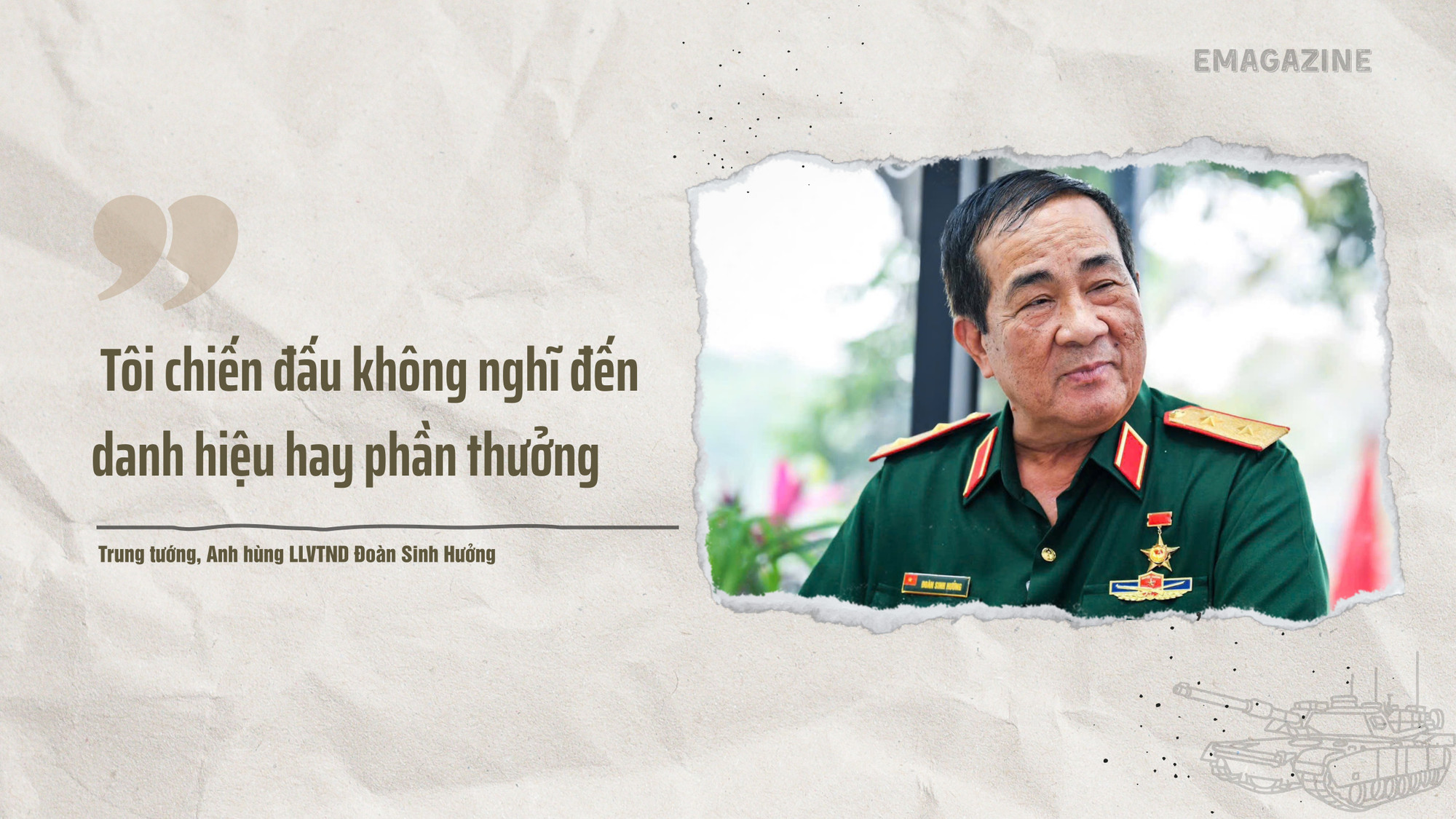 Trung tướng, Anh hùng LLVTND Đoàn Sinh Hưởng (76 tuổi), TS Khoa học quân sự, nguyên Tư lệnh Binh chủng Tăng Thiết giáp, nguyên Tư lệnh Quân khu 4, là một trong những gương mặt hiếm hoi lập “cú đúp” danh hiệu ở độ tuổi đôi mươi: Dũng sĩ diệt Mỹ khi vừa tròn 18 và Anh hùng Lực lượng vũ trang nhân dân ở tuổi 26.