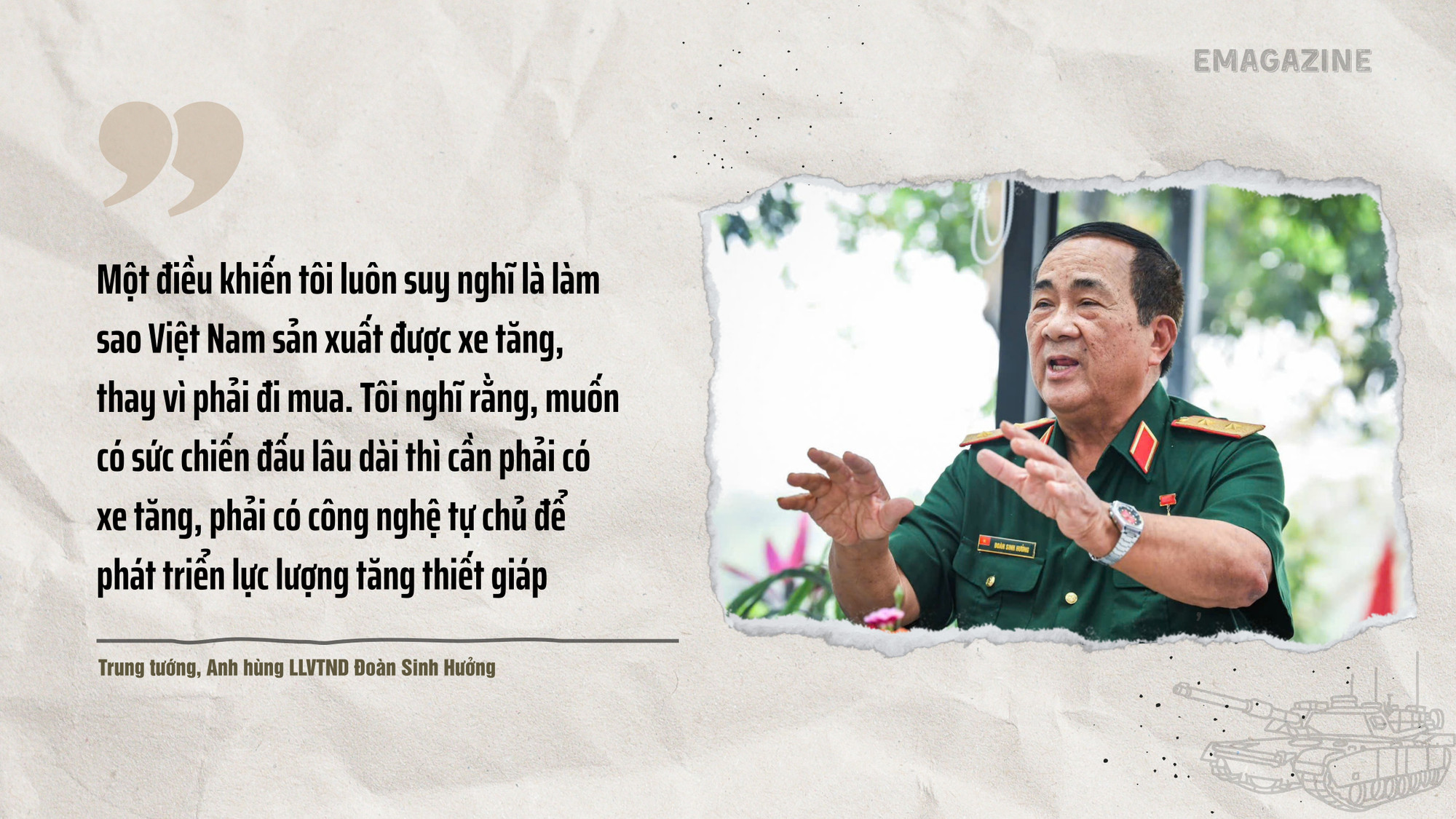 Một điều khiến tôi luôn suy nghĩ là làm sao Việt Nam sản xuất được xe tăng, thay vì phải đi mua. Tôi nghĩ rằng, muốn có sức chiến đấu lâu dài thì cần phải có xe tăng, phải có công nghệ tự chủ để phát triển lực lượng tăng thiết giáp.