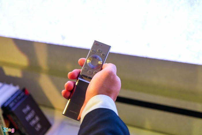 Remote điều khiển TV dùng chất liệu kim loại, mang đến cảm giác cao cấp, nhỏ gọn và ít phím bấm. Samsung tích hợp sẵn phím Ambient Mode ở góc trên bên phải. Thông qua chế độ hình nền Ambient Mode, TV sẽ hiển thị các nội dung trang trí và trở thành một khung tranh “biến hình” trên bức tường nhà người dùng.