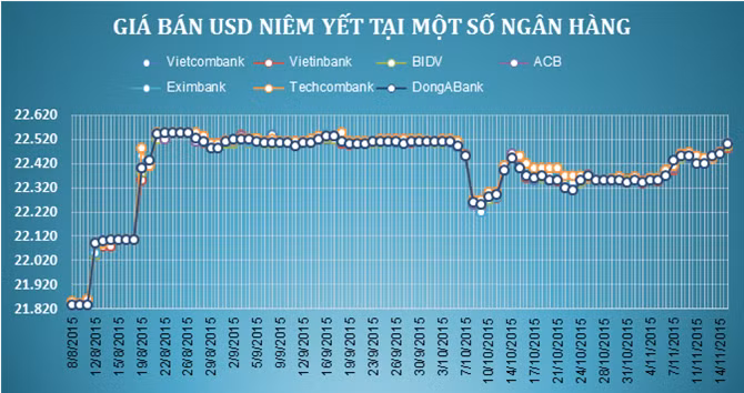 Trong khi đó, các ngân hàng ACB, Eximbank và DongABank đang cùng mua bán USD với giá 22.430-22.500 đồng, trong đó, ACB và Eximbank cùng tăng 20 đồng, riêng DongABank tăng tới 40 đồng so với giá niêm yết lúc đầu giờ sáng nay.