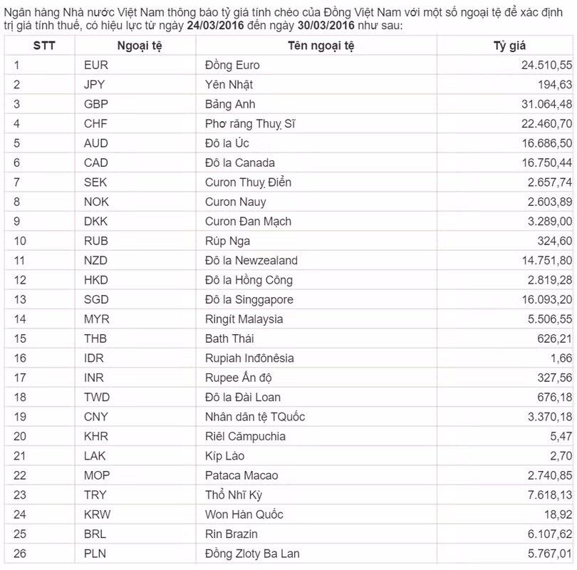 Như thường lệ, trong phiên thứ Năm hàng tuần, NHNN sẽ thông báo tỷ giá tính chéo của Đồng Việt Nam với một số ngoại tệ để xác định trị giá tính thuế. Hôm nay, Thứ Năm ngày 23/03, NHNN cũng công bố tỷ giá chéo áp dụng hiệu lực cho tuần thanh toán từ ngày 24/03/2016 đến ngày 30/03/2016. Cụ thể như sau: