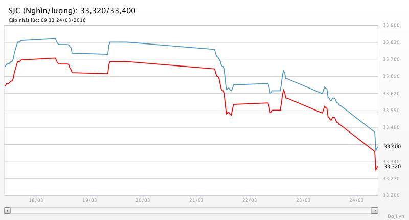 Tương tự, tại các đại lý Doji, giá vàng miếng SJC cũng được Tập đoàn điều chỉnh giảm 170 nghìn đồng về đứng ở 33,32 – 33,40 triệu đồng/lượng (MV-BR) đối với giao dịch lẻ; và đắt hơn 10 nghìn đồng chiều mua, đồng thời rẻ hơn 10 nghìn đồng chiều bán đối với giao dịch buôn ở thị trường Hà Nội. Với biểu giá này, doãng chênh lệch 2 chiều mua – bán vàng SJC tại Doji vẫn là 80 nghìn đồng/lượng.