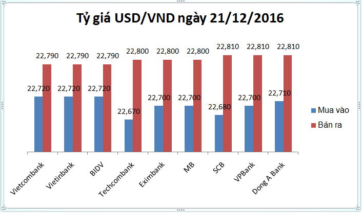 Bán đắt hơn 10 đồng mỗi USD, ngân hàng VPBank và ngân hàng Đông Á bán ra đồng bạc xanh với giá 22.810 đồng, mua vào với giá 22.710 đồng. Giá bán ra liên tục bám sát trần giao dịch cho phép của NHNN.