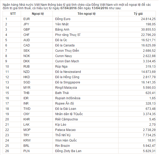 Hôm nay, Thứ Năm (7/4), như thường lệ, NHNN lại thông báo tỷ giá tính chéo của Đồng Việt Nam với một số ngoại tệ để xác định trị giá tính thuế. Tỷ giá chéo có hiệu lực từ ngày 07/04/2016 đến ngày 13/04/2016, cụ thể như sau: