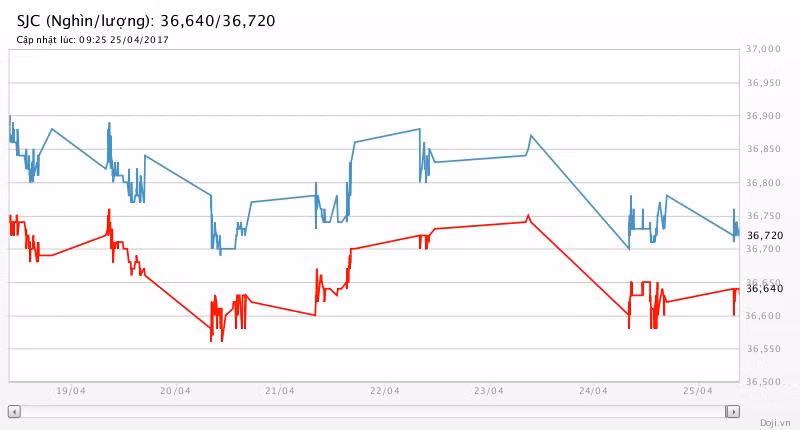 Tại các đại lý của Doji, giá vàng miếng SJC đã được tập đoàn này điều chỉnh tăng 20 nghìn đồng chiều mua nhưng lại giảm 60 nghìn đồng chiều bán so với chốt phiên trước đó, về yết ở 36,64 – 36,72 triệu đồng/lượng (MV-BR) đối với giao dịch lẻ và đắt hơn 10 nghìn đồng chiều mua, đồng thời rẻ hơn 10 nghìn đồng chiều bán đối với giao dịch buôn ở thị trường Hà Nội. Như vậy, chênh lệch 2 chiều mua - bán ở Doji hiện là 80 nghìn đồng/lượng.