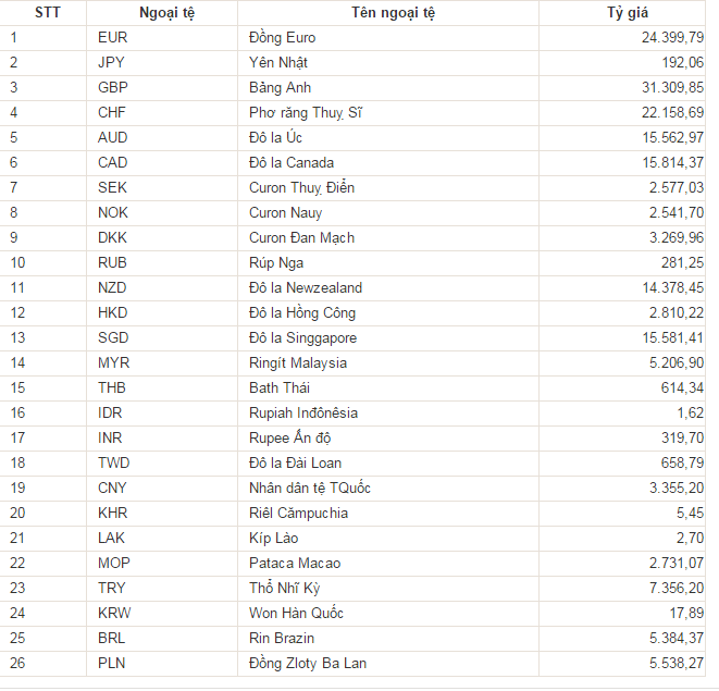 Hôm nay, Ngân hàng Nhà nước Việt Nam cũng thông báo tỷ giá tính chéo của Đồng Việt Nam với một số ngoại tệ để xác định trị giá tính thuế, có hiệu lực từ ngày 18/02/2016 đến ngày 24/02/2016 như sau: