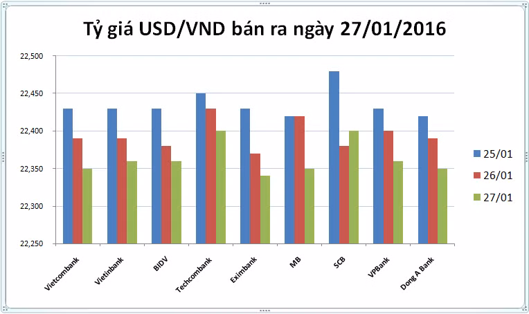 Giá mua vào cao nhất sáng ngày 27/01 được các nhà băng áp dụng là 22.290 đồng đổi 1USD và thấp nhất chỉ nằm ở mức 22.250 đồng/USD được áp dụng tại Techcombank sau khi nhà băng này giảm giá USD xuống 50 đồng.