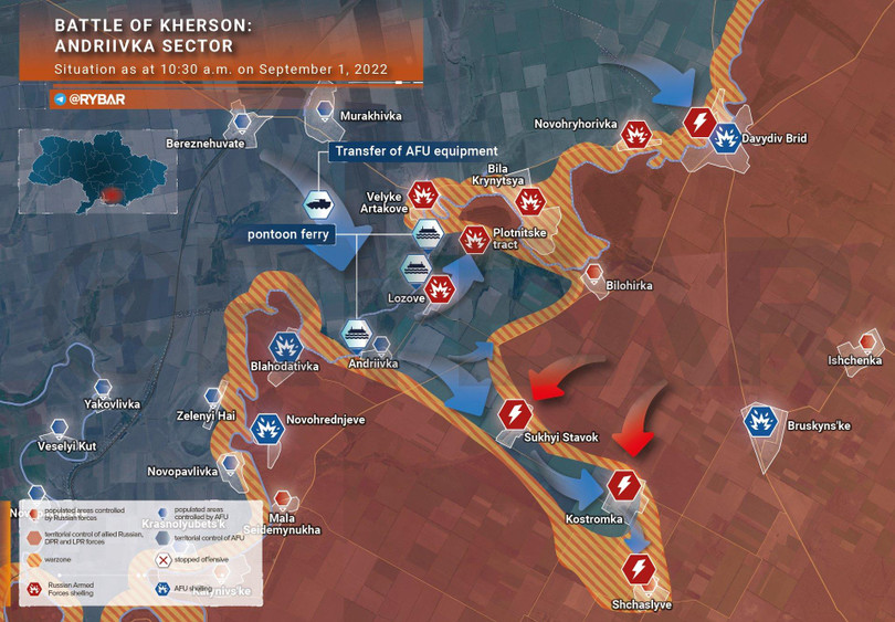 Quân đội Ukraine tiếp tục tiến hành cuộc tấn công trên thảo nguyên trống từ Sukhoi Stavka, đánh chiếm Kostromka và tiếp cận được làng Bruskinsky. Cuối ngày, quân đội Nga giành lại quyền kiểm soát đường Davydov Brod-Bruskinskoye-Novaya Kakhovka và đẩy các đơn vị Ukraine vào vòng vây hỏa lực.