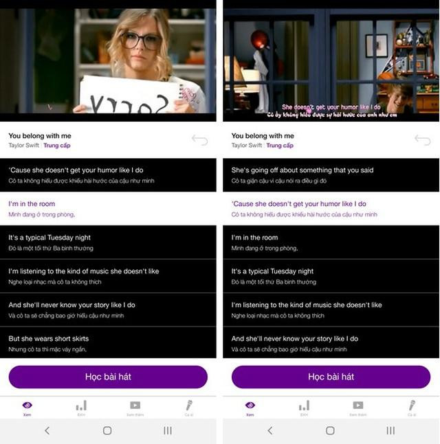 Sau khi chọn được một bài hát yêu thích để vừa nghe nhạc vừa học tiếng Anh, giao diện của ứng dụng sẽ hiển thị nội dung video ở phía trên và làm bài hát ở bên dưới sẽ được hiển thị song ngữ (cả tiếng Anh lẫn tiếng Việt). Lời bài hát sẽ được đồng bộ hóa với nội dung video phía trên (hát đến đâu, giao diện lời bài hát sẽ được làm nổi bật đến đó), giúp người dùng có thể nắm rõ lời bài hát cũng như ý nghĩa của ca khúc.