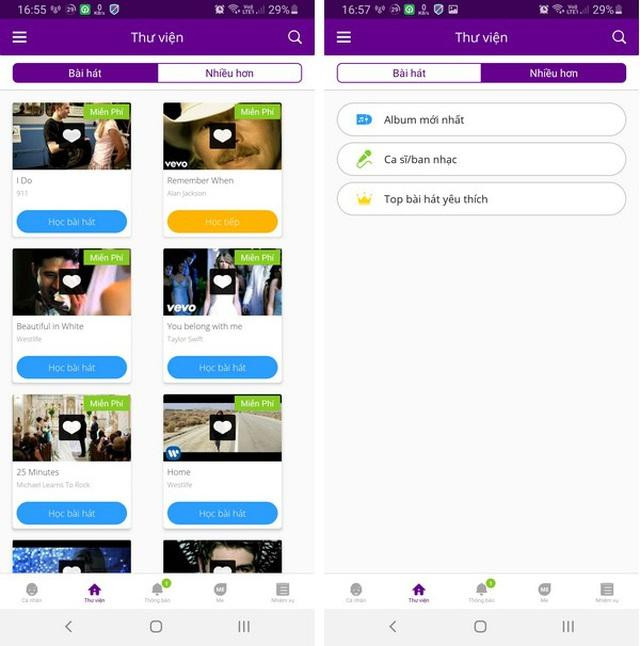 Để bắt đầu học tiếng Anh thông qua các bài hát, bạn nhấn vào mục "Thư viện" ở menu bên dưới, ứng dụng sẽ liệt kê danh sách những bài hát bằng tiếng Anh được nhiều người yêu thích. Bạn có thể chọn tab "Nhiều hơn" từ giao diện này để tìm kiếm các bài hát theo tên nghệ sĩ/ca sĩ hoặc các bài hát được người dùng Voca Music yêu thích và lựa chọn nhiều nhất để học tiếng Anh.