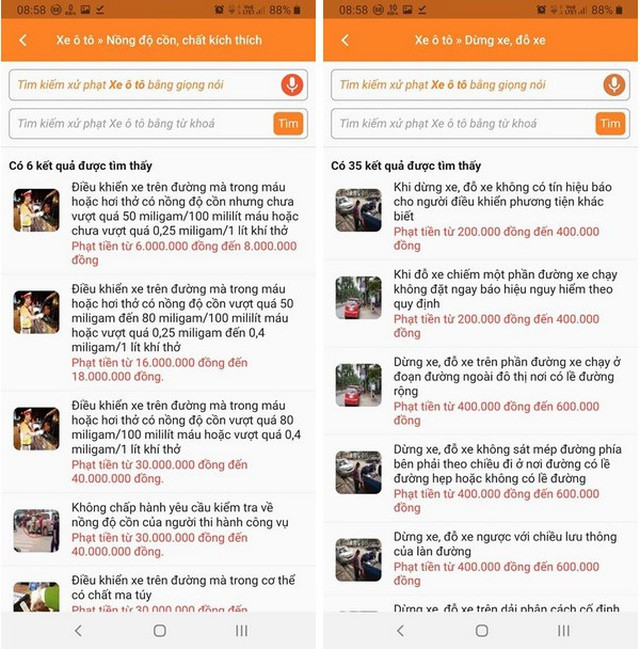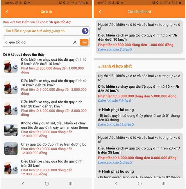 Chẳng hạn bạn gõ hoặc nói từ khóa “đi quá tốc độ” để tìm kiếm các mức xử phạt của lỗi vi phạm này, ứng dụng sẽ lập tức liệt kê các mức xử phạt ở kết quả tìm kiếm, bạn có thể nhấn vào từng kết quả tìm kiếm để xem thêm thông tin chi tiết về mức xử phạt (như số tiền, thời hạn tịch thi bằng lái xe...).