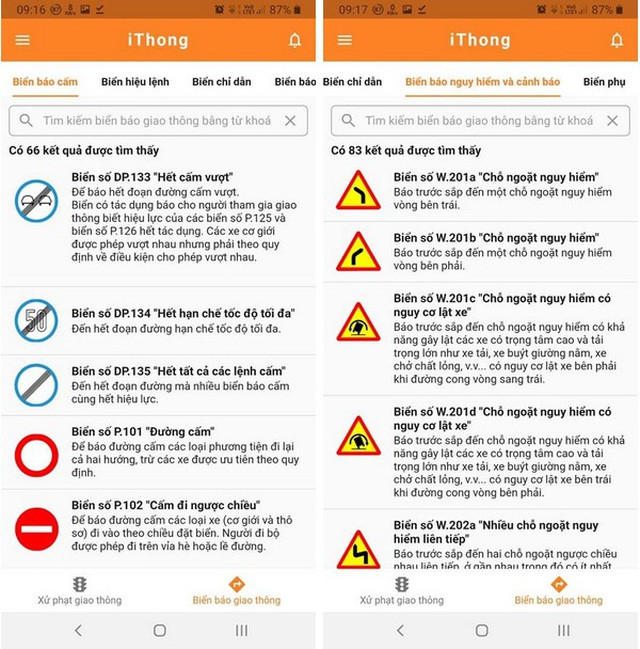 Ứng dụng sẽ phân chia biển báo giao thông ra từng loại, như các loại biển cấm, biển hiệu lệnh, biển chỉ dẫn, biển cảnh báo... để người dùng có thể dễ dàng tìm kiếm và tra cứu các biển báo giao thông mà mình chưa nắm rõ.