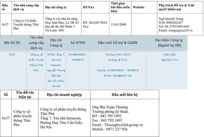 Thông tin về công ty Thái Phú được 3 nhà mạng cung cấp (thứ tự Vinaphone, Mobifone,Viettel)