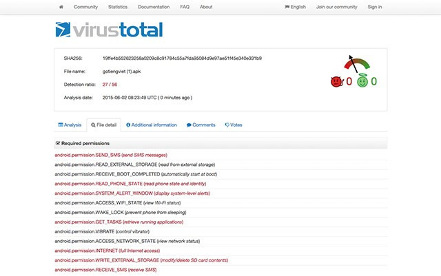 Nếu nghi ngờ, người dùng nên upload các file cài đặt ứng dụng lên một số trang web hỗ trợ quét virus để phát hiện mã độc như virustotal.com, hoặc tải lên hòm thư Gmail. Các trang web này sẽ cảnh báo những ứng dụng đòi hỏi các quyền hạn "nhạy cảm", có thể khiến bạn bị mất tiền.