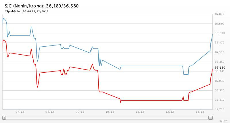 Tương tự, tại các đại lý của Doji, giá vàng miếng SJC lại được Tập đoàn này điều chỉnh tăng mạnh 280 nghìn đồng chiều mua và 380 nghìn đồng chiều bán liên niêm yết ở mức 36,18 – 36,58 triệu đồng/lượng (MV-BR) đối với giao dịch lẻ; và đắt hơn 10 nghìn đồng chiều mua, đồng thời rẻ hơn 10 nghìn đồng chiều bán đối với giao dịch buôn ở thị trường Hà Nội. Hiện, doãng chênh lệch 2 chiều mua - bán ở Doji là 400 nghìn đồng/lượng.