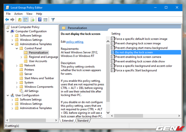 Tiếp theo bạn hãy nhìn vào khung tùy chọn bên phải, tìm và nhấn đôi vào tùy chọn “Do not display the lock screen”.