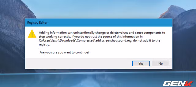 Tải về gói tin nén ZIP có chứa khóa Registry để kích hoạt tùy chọn SnapShot trong Sounds tại đây, sau đó khởi chạy tập tin “add screenshot sound.reg”.