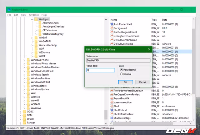 Nhấn phải chuột vào khung bên phải của Winlogon và tạo một một DWORD 32-bit mới với tên gọi là “DisableCAD” và đặt giá trị cho nó là “0”, sau đó lưu lại là xong.