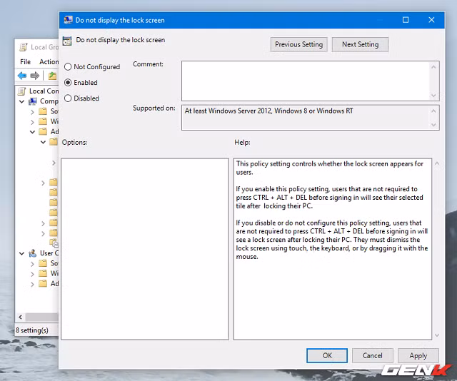 Hộp thoại cấu hình của tùy chọn này sẽ xuất hiện, bạn hãy đánh dấu vào tùy chọn Enabled và nhấn Apply -> OK để lưu lại, sau đó đóng hộp thoại Local Policy Editor lại.