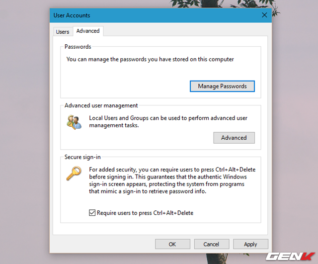 Trong User Accounts, bạn hãy nhấn vào tab Advanced và đánh dấu vào tùy chọn “Require users to press Ctrl+Alt+Del”.