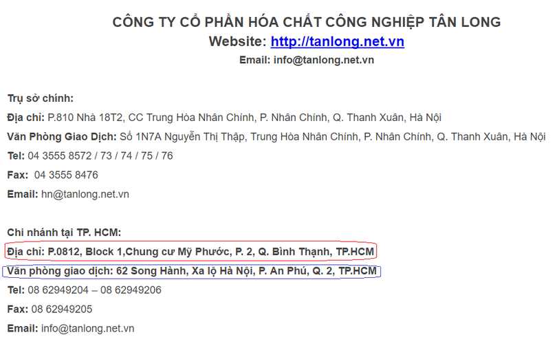 Nên biết, “62 đường Song Hành, xa lộ Hà Nội, Phường An Phú, Quận 2, TP Hồ Chí Minh” cũng là địa chỉ mà CTCP Hóa chất Công nghiệp Tân Long (Tân Long) đăng ký làm văn phòng giao dịch cho Chi nhánh tại TP. HCM – theo như công bố của công ty này trên website.