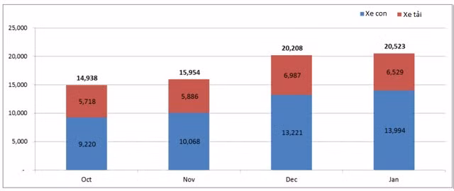 Đồng thời, cũng theo báo cáo của VAMA, sản lương tiêu thụ xe con trong tháng đạt 13.679 xe và xe tải đạt 6.300 xe. Doanh số xe con tăng 3% và xe tải giảm 10% so với tháng trước. So với cùng kỳ năm trước, xe con tăng 64% và xe tải tăng 30%.