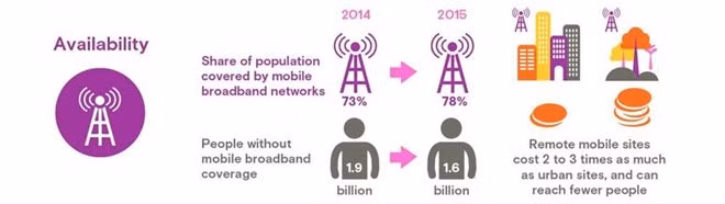 Độ phủ sóng là vấn đề lớn đầu tiên. Phần lớn người dùng mới sẽ tiếp cận Internet thông qua điện thoại 3G hoặc 4G. Tuy vậy, vẫn có đến 1,6 tỷ người sống ở những khu vực thiếu những kết nối này. Hơn 90% trong số đó từ các nước thế giới thứ ba: Đông Nam Á, khu vực châu Phi hạ Sahara.