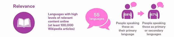 Cũng theo báo cáo, Google Android chỉ hỗ trợ 76 ngôn ngữ, và Facebook là 139. Nghĩa là Facebook chỉ có thể tiếp cận đến 83% người dùng biết 2 ngôn ngữ, và họ cần đến 800 ngôn ngữ để tiếp cận 98% người dùng.