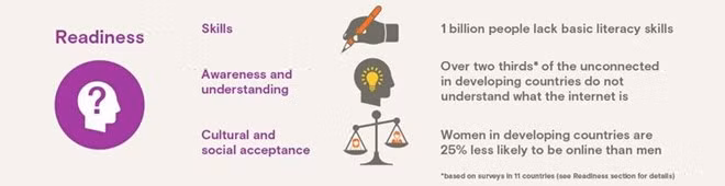 Giá cước cũng là vấn đề lớn. Báo cáo cho thấy gần 30% dân số ở các nước đang phát triển vẫn đang sống dưới mức nghèo, và 2 tỷ người không đủ khả năng chi trả cho 500MB dữ liệu Internet mỗi tháng.