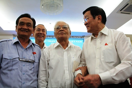 Chủ tịch nước Trương Tấn Sang và đại biểu Trần Du Lịch hỏi thăm cử tri sau buổi tiếp xúc