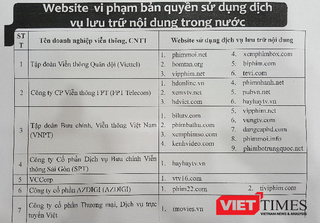 Được biết, tính tới tháng 6/2017, trong 50 website vi phạm bản quyền phim, có 22 website sử dụng hosting của các doanh nghiệp (DN) viễn thông trong nước và 28 website sử dụng hosting của DN nước ngoài. Đến tháng 8/2017, số website sử dụng hosting trong nước là 5, nhưng ở nước ngoài là 42.