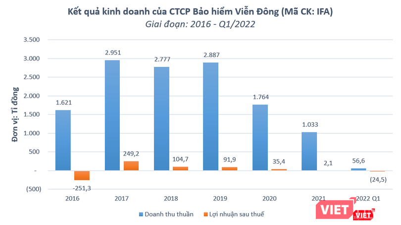 Kết quả kinh doanh 'u ám' của IFA kéo dài sang quý đầu năm 2022 khi doanh thu thuần từ hoạt động kinh doanh bảo hiểm chỉ đạt 56,6 tỉ đồng, giảm 83,7% so với quý 1/2021. Lợi nhuận sau thuế 3 tháng đầu năm 2022 là âm 24,6 tỉ đồng, trong khi cùng kỳ năm trước lãi 20,3 tỉ đồng.