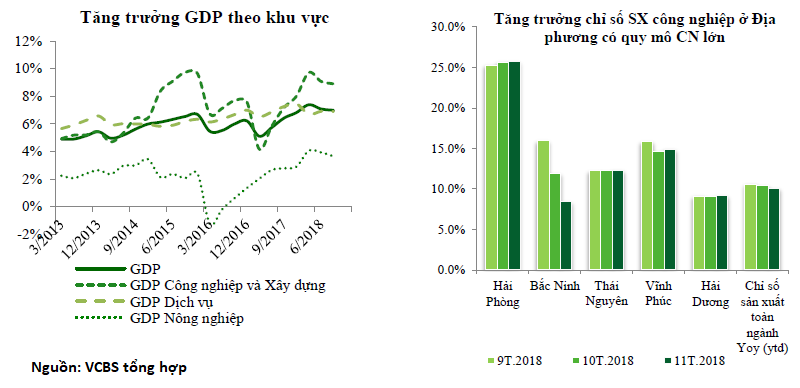 Đánh giá tình hình vĩ mô năm 2018, các chuyên gia của Công ty Chứng khoán Vietcombank (VCBS) vẫn giữ nguyên dự báo tăng trưởng năm nay sẽ vượt mức mục tiêu Quốc hội đề ra và dao động trong khoảng từ 6,9% - 7,1%. Trong đó, khu vực dịch vụ và công nghiệp chế biến chế tạo tiếp tục là điểm sáng hỗ trợ tăng trưởng, đóng vai trò đầu tàu giúp nền kinh tế phát triển.