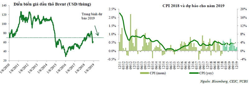 Về lạm phát, các chuyên gia dự báo chỉ số này sẽ ở mức 4 - 4,5% trong năm 2019 do chịu áp lực đáng kể từ diễn biến của giá xăng, dầu và dư địa lùi lộ trình tăng giá các dịch vụ công (giá điện, mức đóng BHYT, dịch vụ giáo dục...) eo hẹp hơn trước.