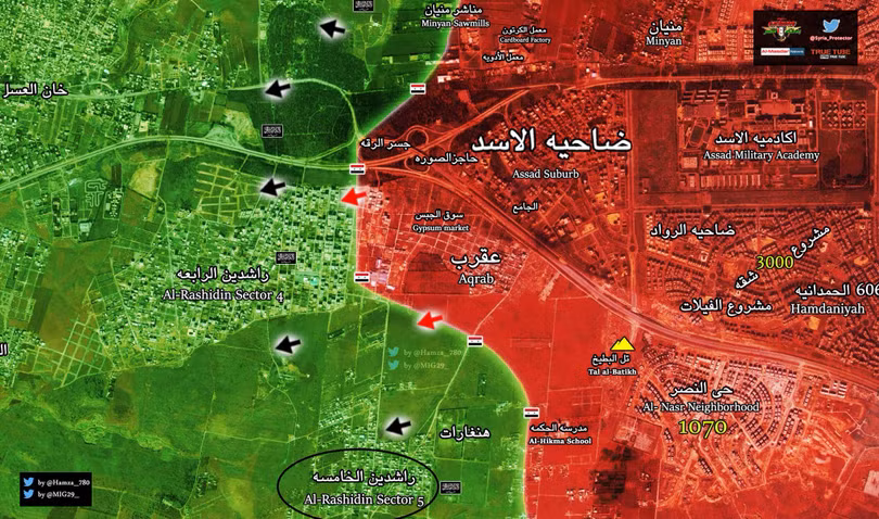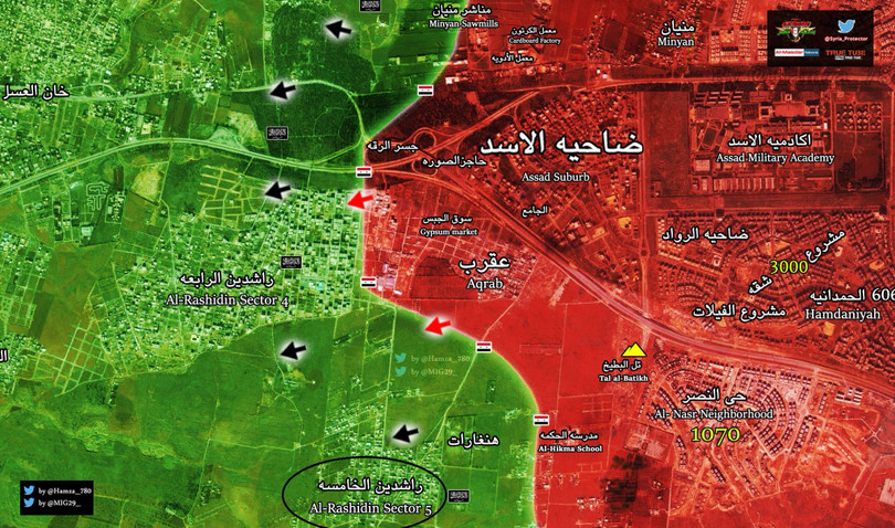 Ngày 25.02.2017, quân đội Syria đánh chiếm đồi Rashideen, có tầm nhìn khống chế vùng ngoại ô rộng lớn. Đòn tấn công chiến thuật hiệu quả này mở đường cho cuộc tấn công đánh chiếm quận Rashideen 5 (còn được gọi là khu Al-Ansari). Năm ngày trước, Vệ binh Cộng hòa giải phóng được khu vực Aqrab gần đó.