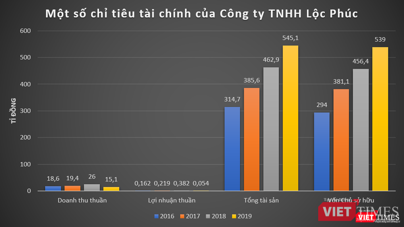 Dữ liệu của VietTimes cho thấy, trong 4 năm trở lại đây, kết quả kinh doanh của Lộc Phúc chưa cho thấy sự tương xứng với quy mô tài sản, nguồn vốn. Gần nhất là năm 2019, Lộc Phúc ghi nhận doanh thu thuần đạt 15,1 tỉ đồng, tuy nhiên lãi thuần chỉ vỏn vẹn 54 triệu đồng, tương ứng với biên lợi nhuận 0,35%.