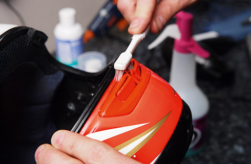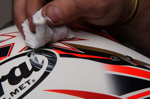 Sử dụng khăn mềm thấm xà phòng nhẹ nhàng lau qua một lượt bên ngoài mũ bảo hiểm để tránh làm xước. Với những mũ bảo hiểm gắn kính, sử dụng bàn chải đánh răng nhẹ nhàng gẩy bụi bẩn ra khỏi các lỗ bắt ốc.