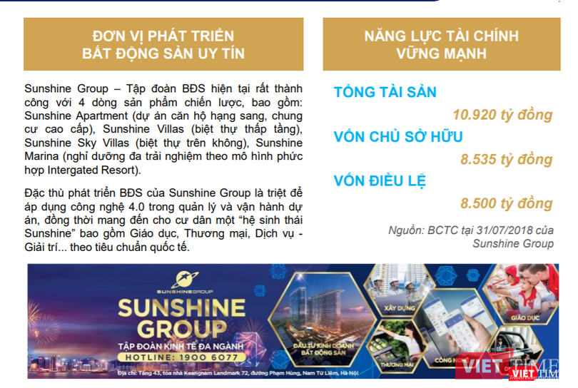 Tính đến cuối tháng 7/2018, tổng tài sản của Sunshine Group đạt gần 11.000 tỷ đồng, cho thấy phần lớn các dự án mà tập đoàn này đã công bố đang ở giai đoạn triển khai đầu.