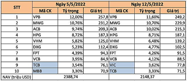 Về danh mục quỹ, top 10 khoản đầu tư không còn sự xuất hiện của cổ phiếu MBB. Trong ngày 12/5, nhóm quỹ Dragon Capital đã bán 1,5 triệu cổ phiếu MBB, giảm lượng sở hữu từ 40,2 triệu đơn vị (tỷ lệ 1,1%) xuống 38,7 triệu đơn vị (tỷ lệ 1%). Bên cạnh đó, cổ phiếu TCB tụt một hạng với tỷ trọng còn hơn 3,3%.